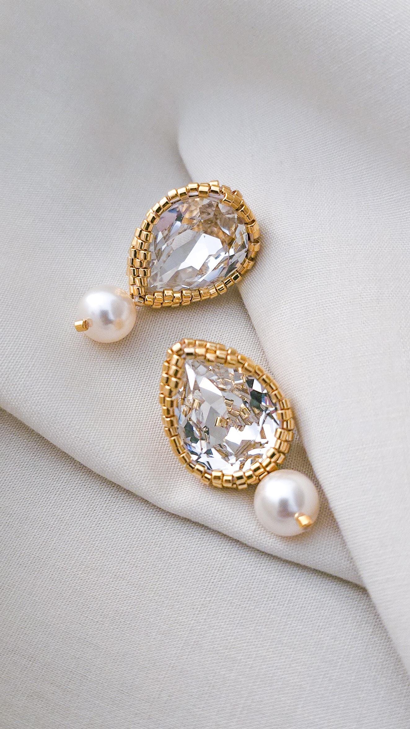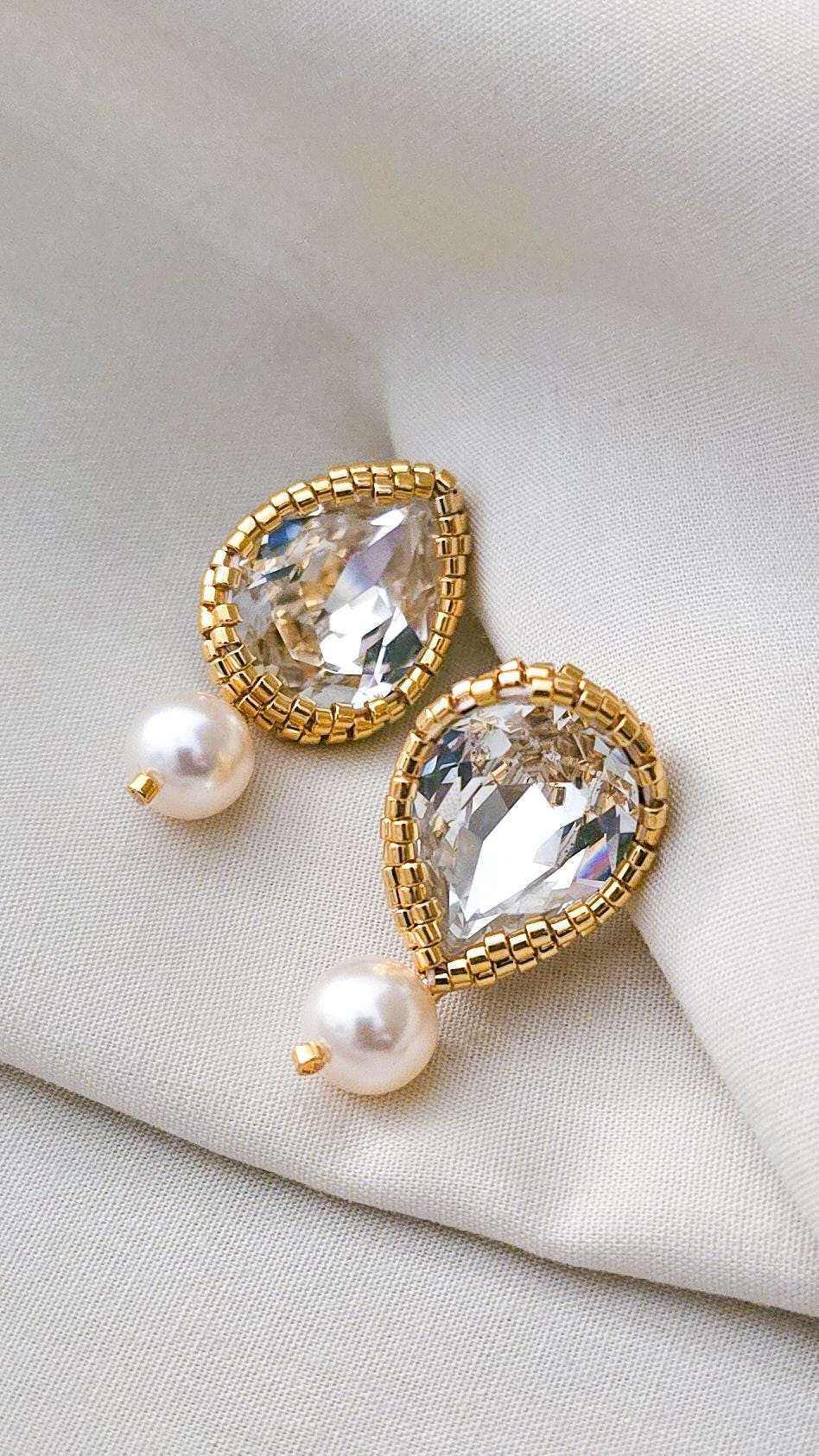 Dazzling pear cut clear Swarovski crystal sparkles like the quivering rain drops from the showers' end, a sign of mercy from the heavens together with a drop wisdom pearls.