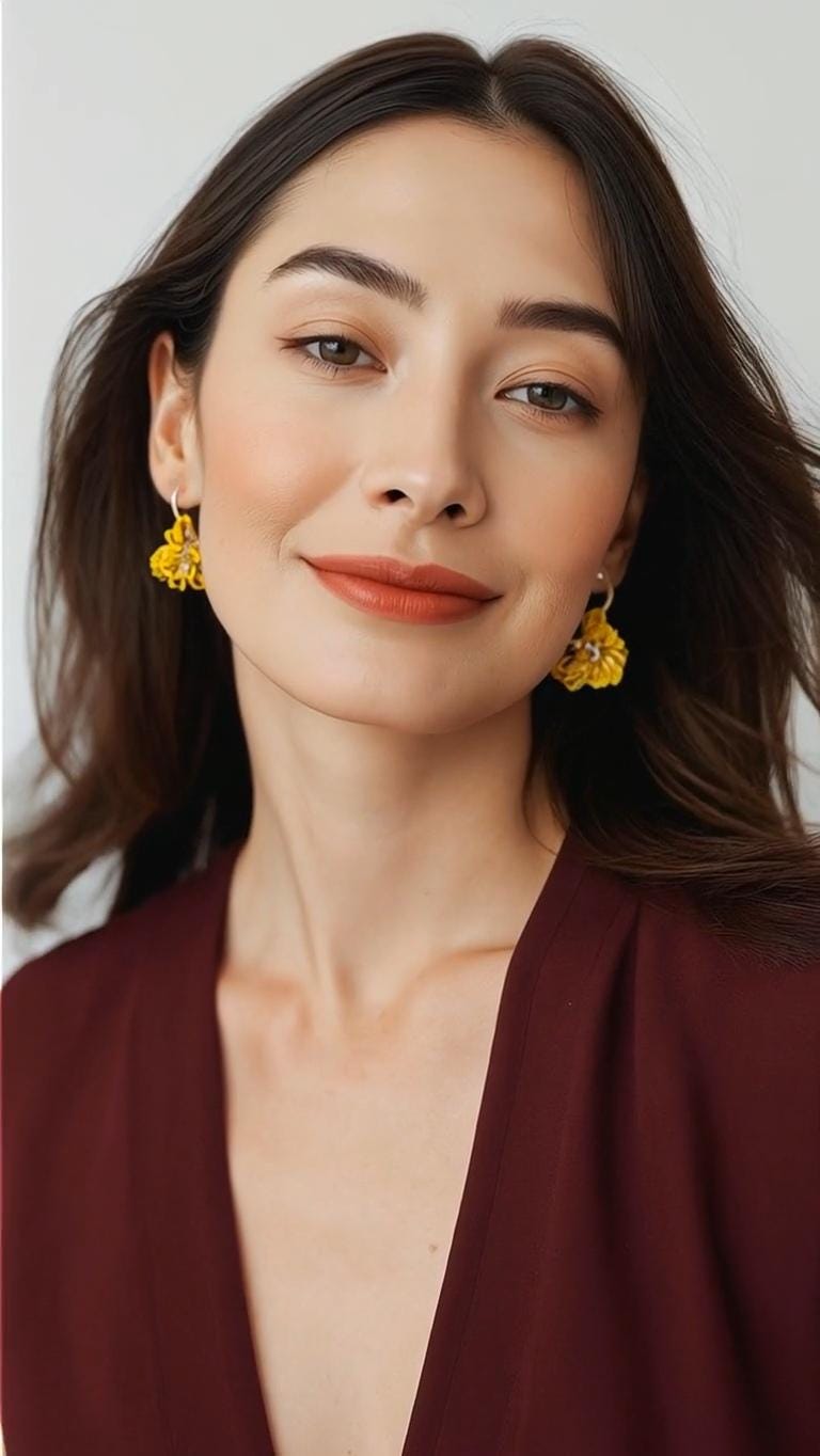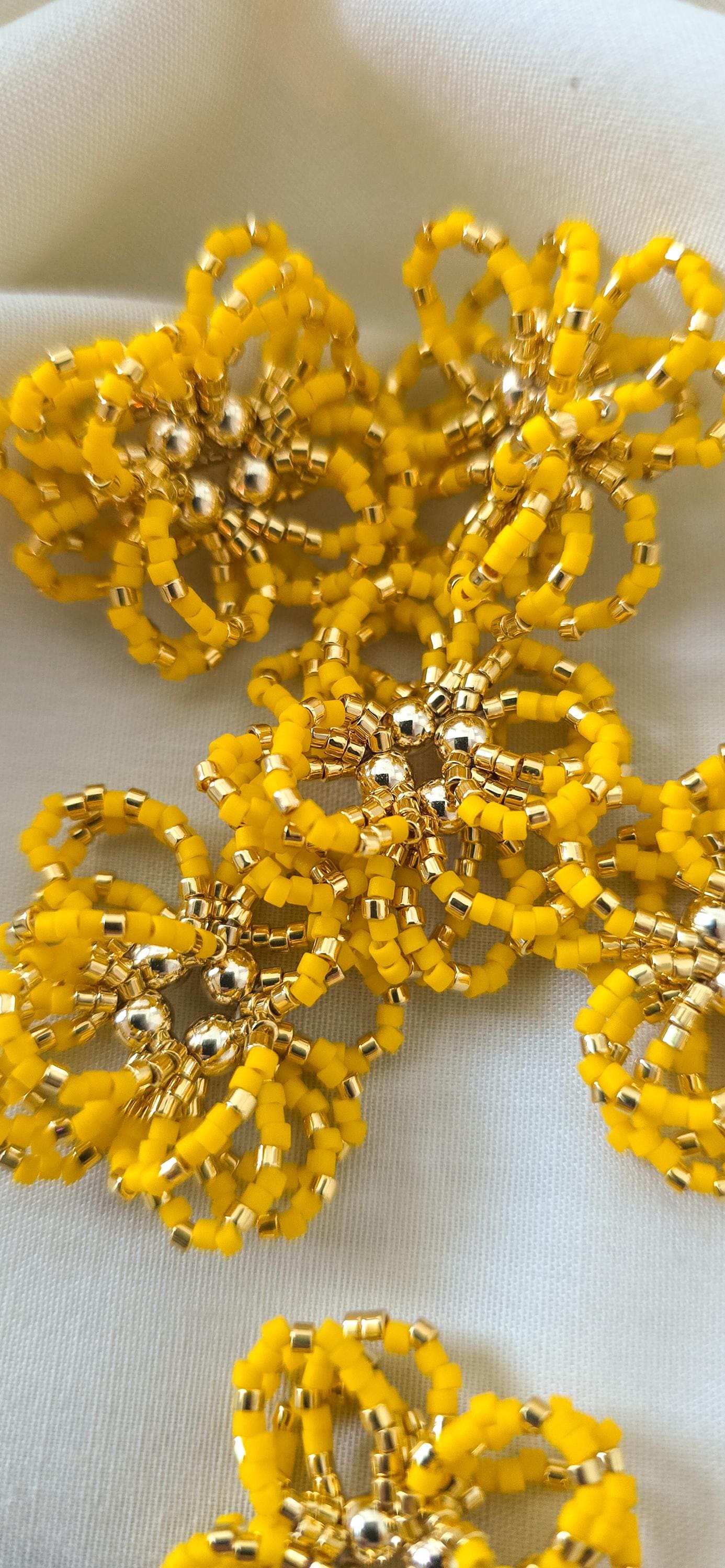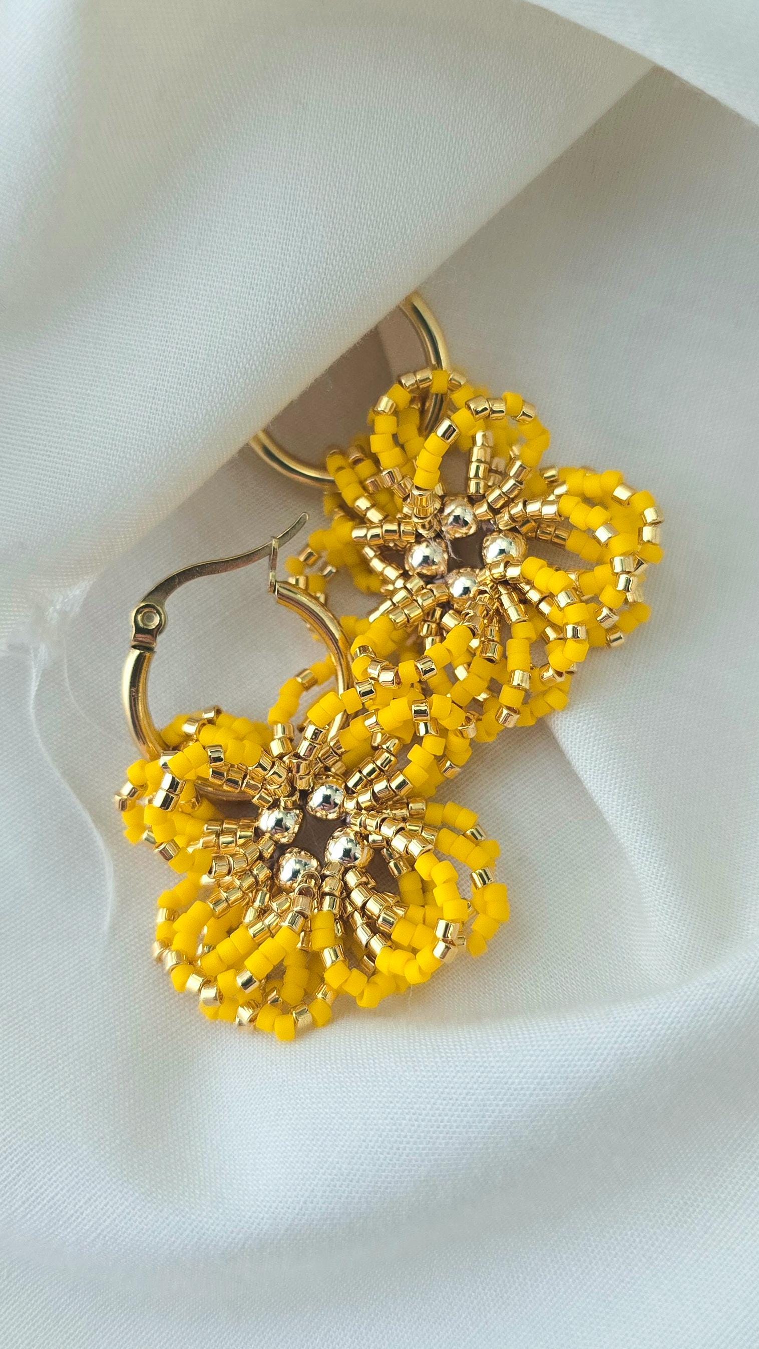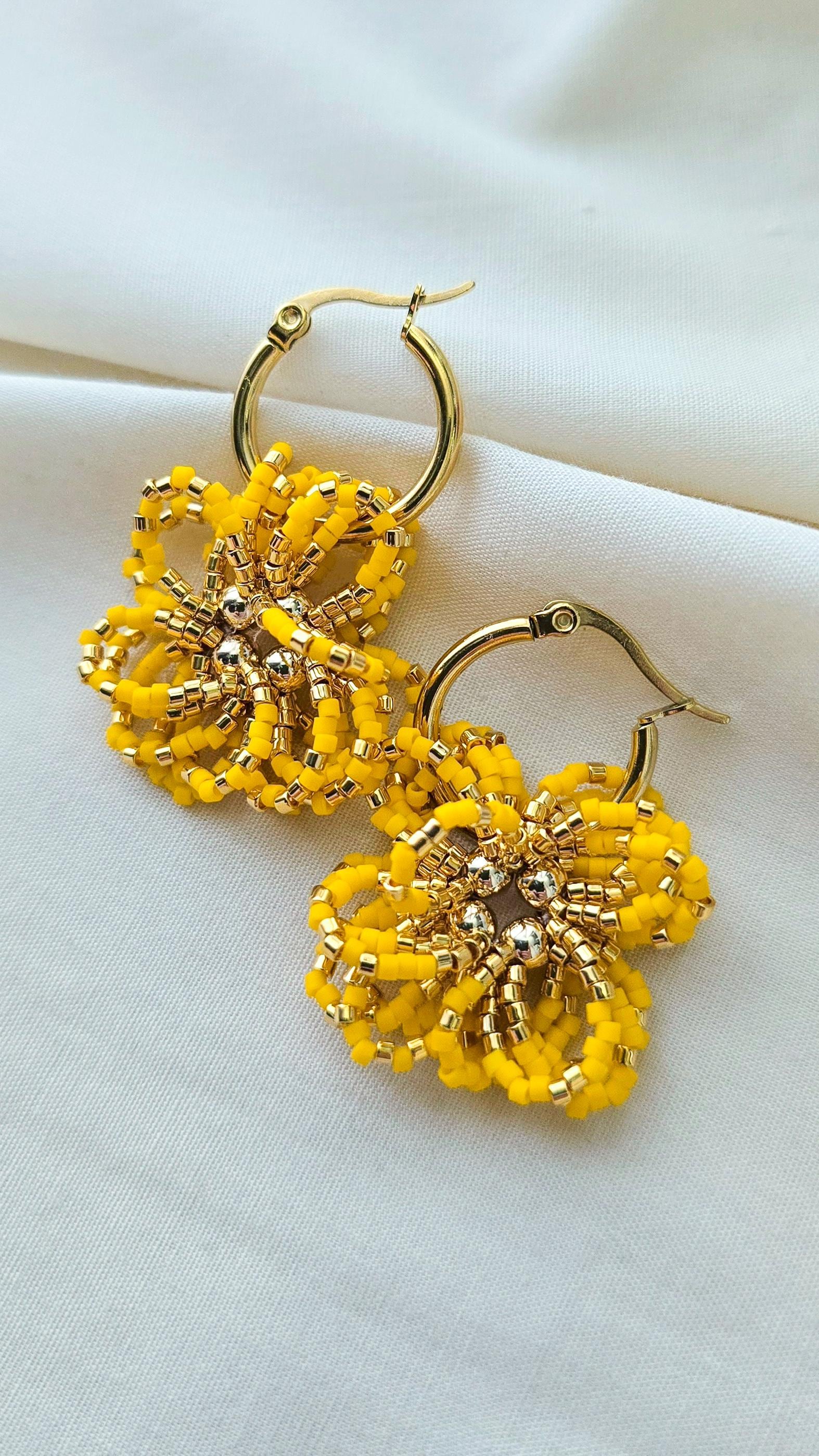 Hand-sewn in vibrant canary yellow, each beaded bloom gathers around a gold centre, resting on softly curved hoops that move with ease. There is joy here — not fleeting excitement, but the kind that steadies and lifts at the same time.