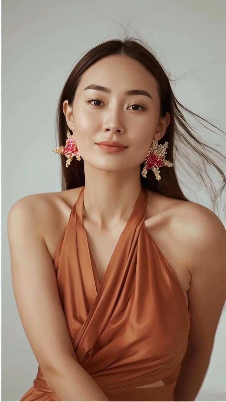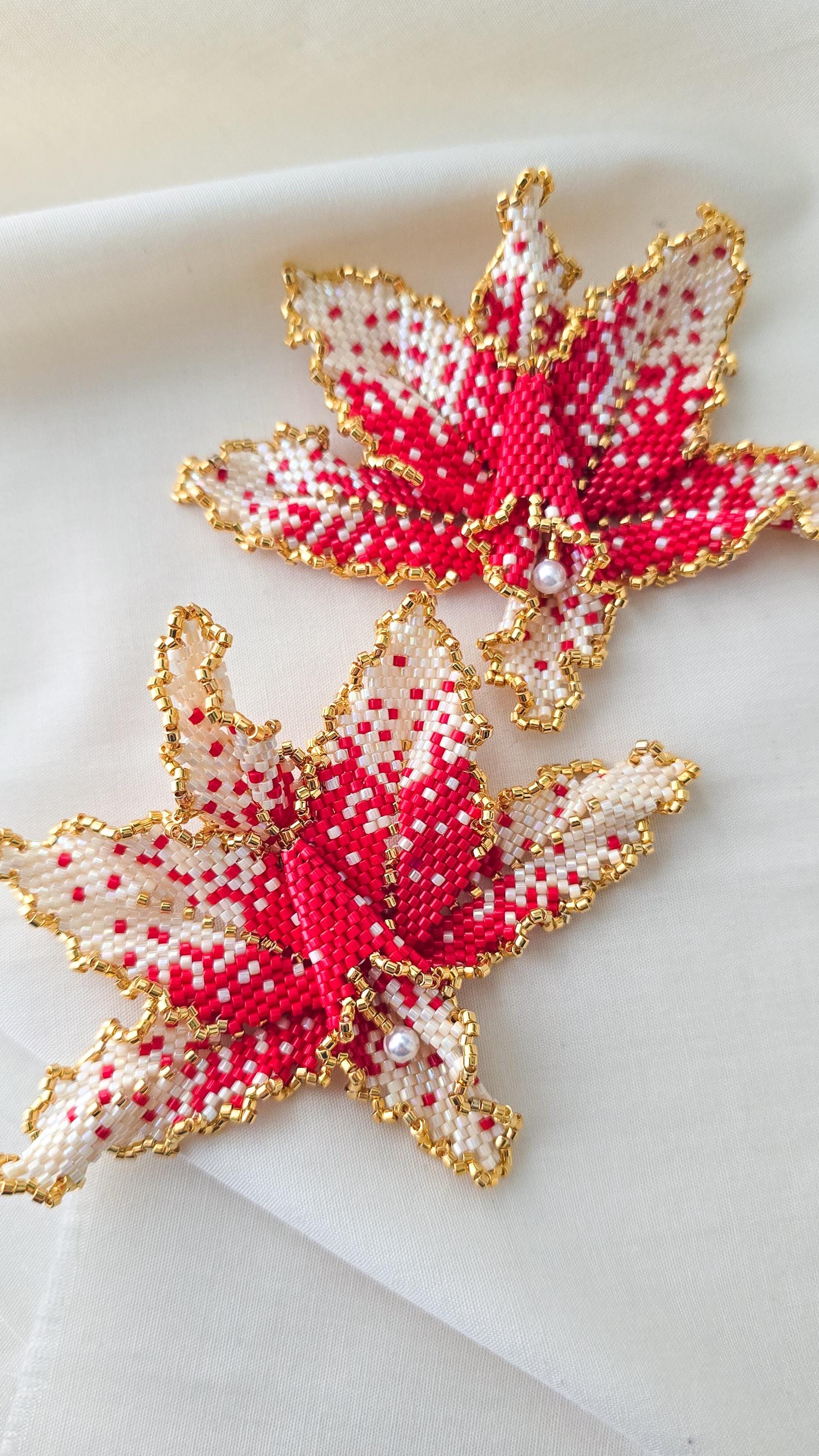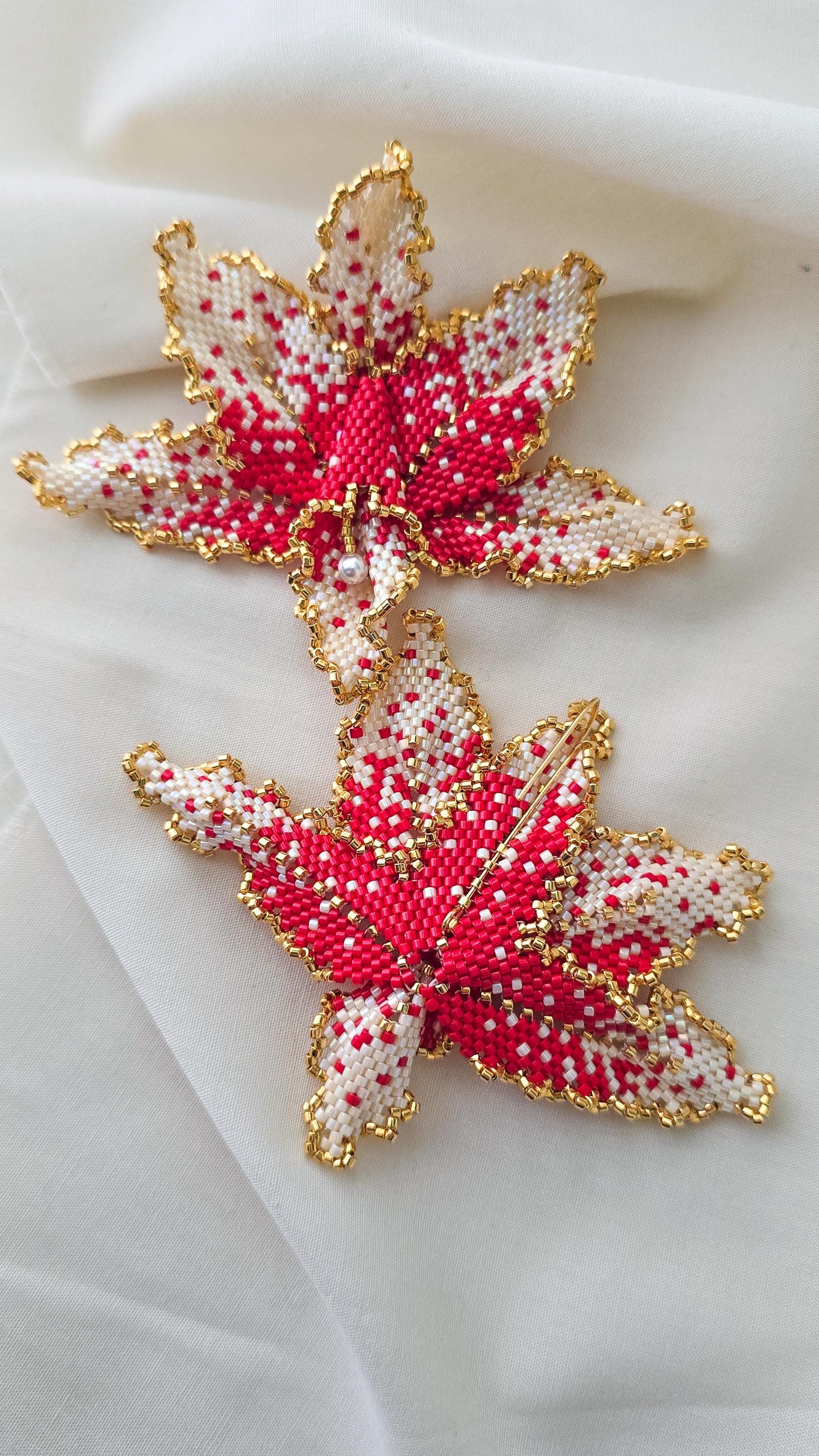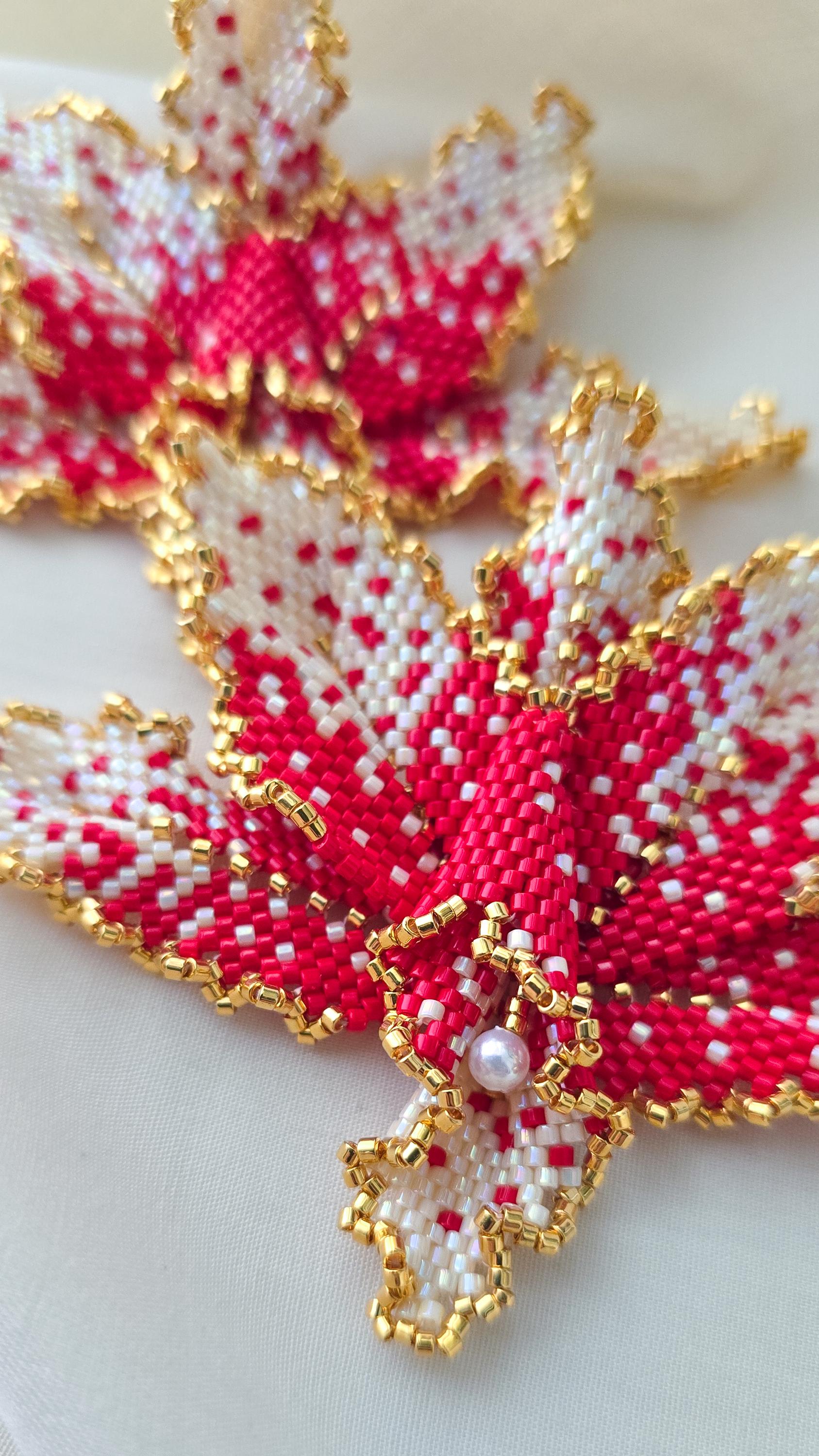 Hand-sewn bead by bead, its petals unfold in layered speckled red or pink and soft ivory, edged with gold that catches light gently rather than demands it. There is warmth here — not loud, but assured. A calm intensity that sits close to the skin and lingers.
